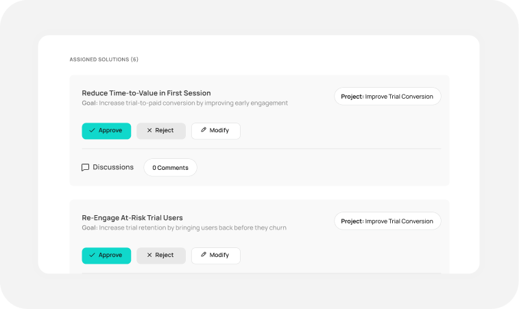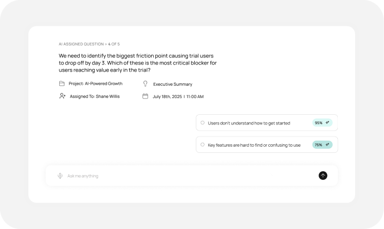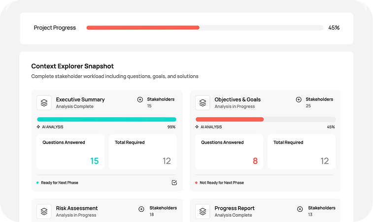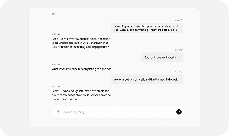 AI Agents evaluate context for any project and dynamically identify which stakeholders and which roles are required to inform context, align the team, close gaps and achieve approvals and sign-off. AI takes the lead in creating and maintaining planning and presentation assets, distributing questions, work, and keeping everyone informed.