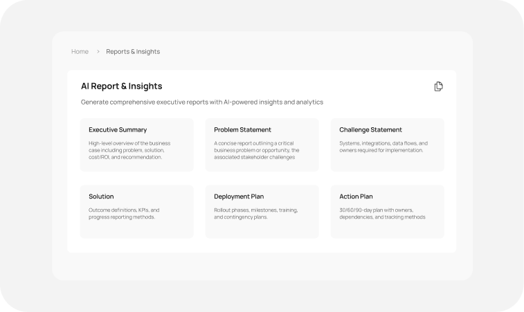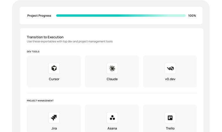 AI Agents prepare for seamless transition to execution. When details are complete, gaps addressed, risks mitigated, and requirements approved, aligned to priorities, budget, and constraints - a single click injects plans, assets, and prototypes into development, project management, or procurement workflows, automating transition while preserving traceability.