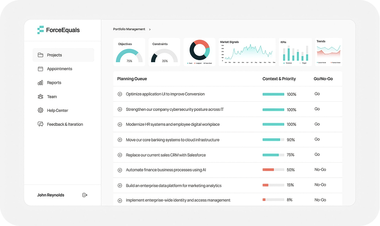 ForceEquals unifies portfolio prioritization, discovery, planning, project charter, and execution handoff in a single platform.